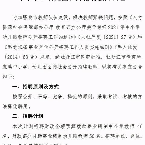 1、牡丹江市第一中学招聘教师:招聘科目包括语文、数学、英语等,要求具有相应的教师资格证书,本科及以上学历,有教学经验者优先。